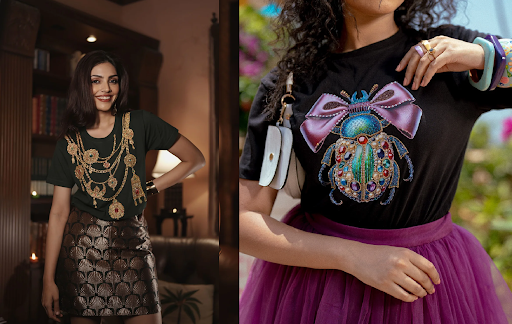 The Duchess Kumari Jewel Embroidered T-Shirt is a masterpiece that mimics layered gold necklaces. It balances heritage detailing with a contemporary silhouette, making it a top pick for women who love elegance tucked inside comfort.